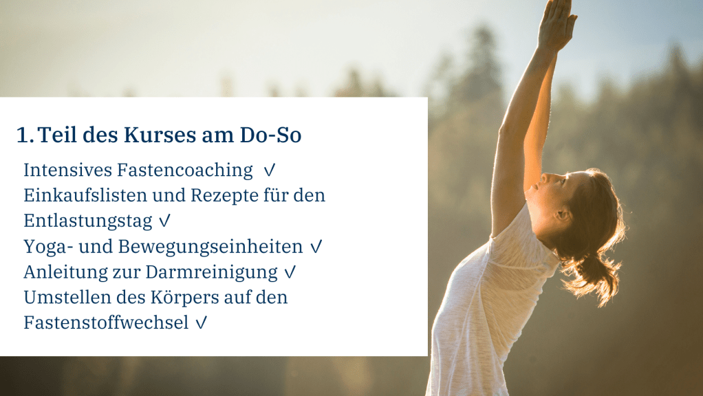 Unsere Fasten und Yoga Woche ist so konzipiert, dass Du neben Deiner Arbeit fasten kannst. Du entschlackst Deinen Körper, findest mehr Zeit für Dich im Alltag und schaffst es endlich ein paar ungesunde Gewohnheiten zu ändern.