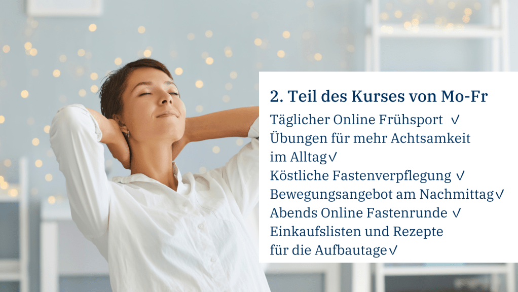 Am Morgen begrüßt Dich Dein Fastencoach online mit wohltuenden Stretching und Aktivierungsübungen. ( 20 min.) Du startest voller Energie in den Tag. Und das ganz ohne Kaffee!